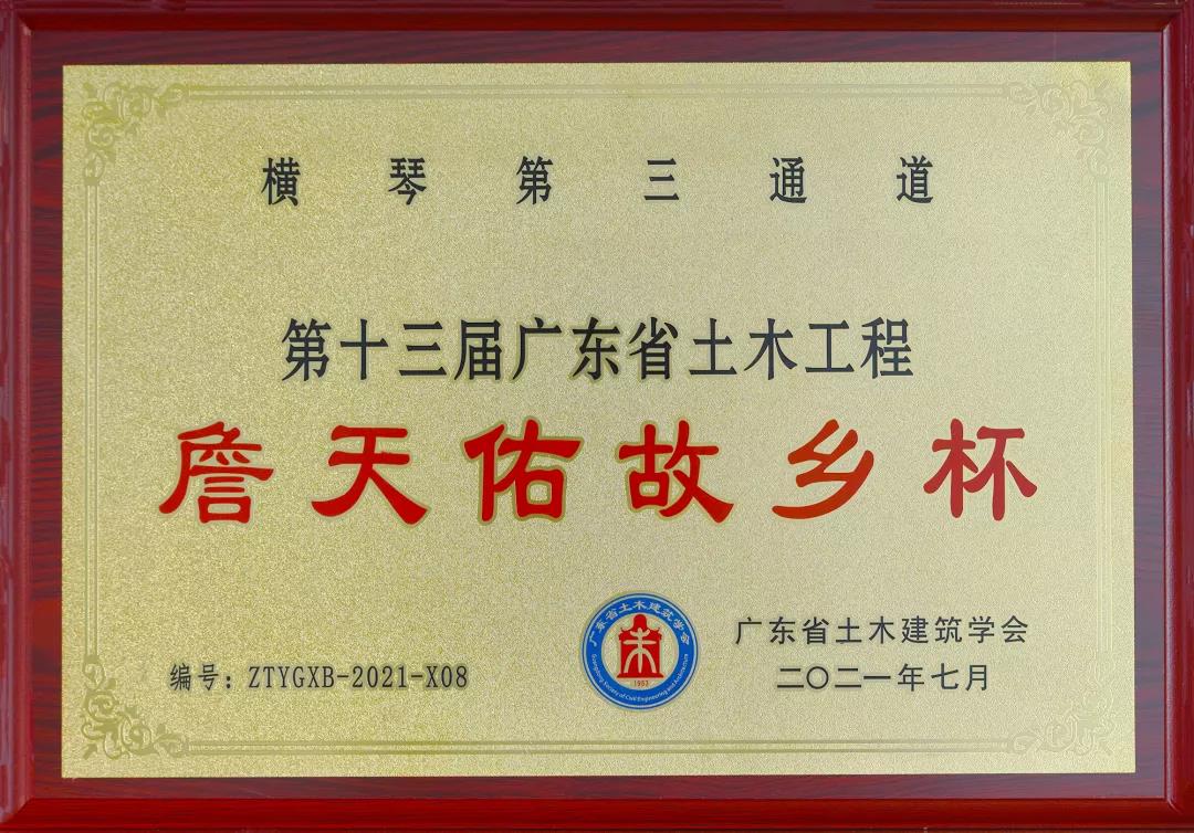 廣東省土木工程“詹天佑故鄉(xiāng)杯”獎創(chuàng)立于2009年,是廣東省土木建筑工程科技創(chuàng)新領(lǐng)域最高榮譽獎,每年由廣東省土木建筑學(xué)會組織專家評審一次,每次評出獲獎項目不超過15項,旨在獎勵在科技創(chuàng)新和應(yīng)用方面成績顯著的土木建筑工程項目和主創(chuàng)人員。橫琴隧道