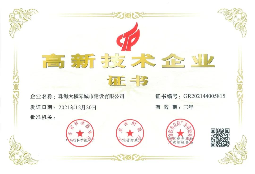 近日,珠海大橫琴城市建設(shè)有限公司收到廣東省科學(xué)技術(shù)廳、廣東省財政廳、國家稅務(wù)總局廣東省稅務(wù)局聯(lián)合頒發(fā)的高新技術(shù)企業(yè)證書,正式通過高新技術(shù)企業(yè)認(rèn)定。此次高新技術(shù)企業(yè)的認(rèn)定是對城建公司在核心自主知識產(chǎn)權(quán)、科技成果轉(zhuǎn)化能力、研究開發(fā)水平、組織管理水平及成長性指標(biāo)的綜合評估和認(rèn)定。